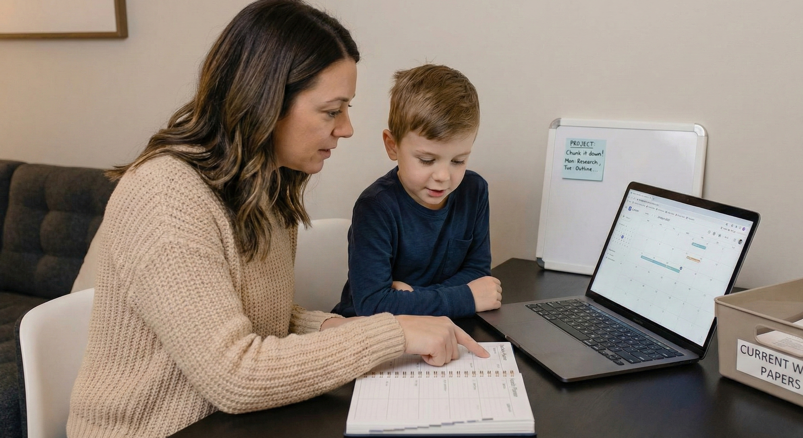 Teach Task Chunking: Large projects are overwhelming. Help your child break them down. If a paper is due Friday, help them decide: Research on Monday, Outline on Tuesday, Draft on Wednesday, Review on Thursday.