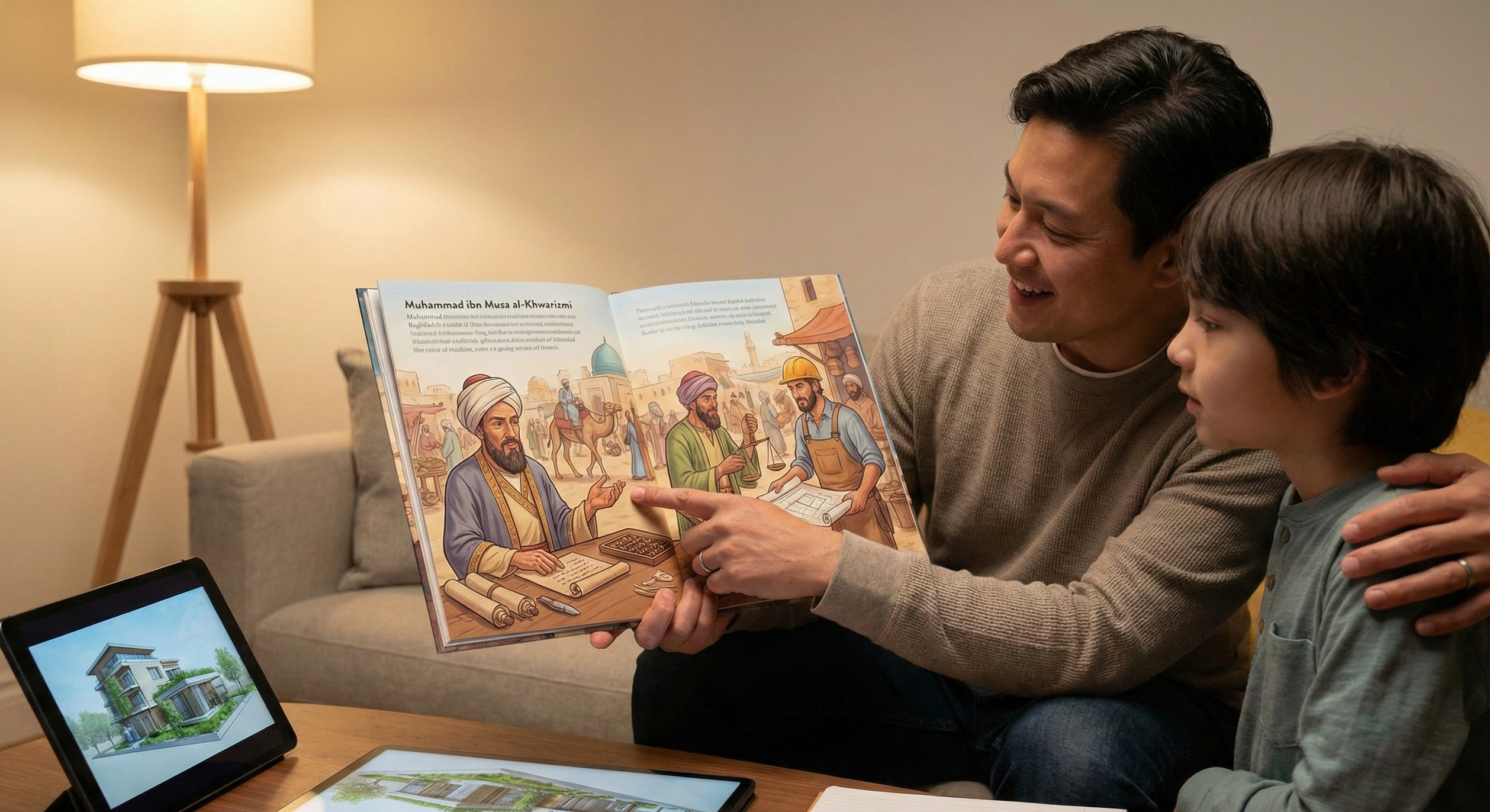 How: Tell your child a short story about al-Khwarizmi working with merchants and builders in ancient Baghdad, solving problems that mattered to people at the time. Then ask, “What modern problem might need similar thinking?”